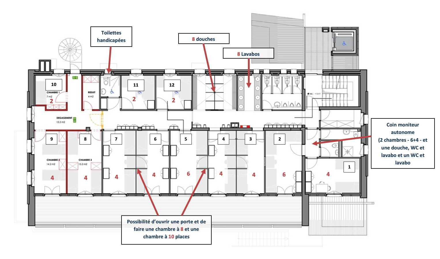 - Sur chaque étage, il existe la double possibilité de fusionner 2 chambres à 4 pour en faire de petits dortoirs à 8.