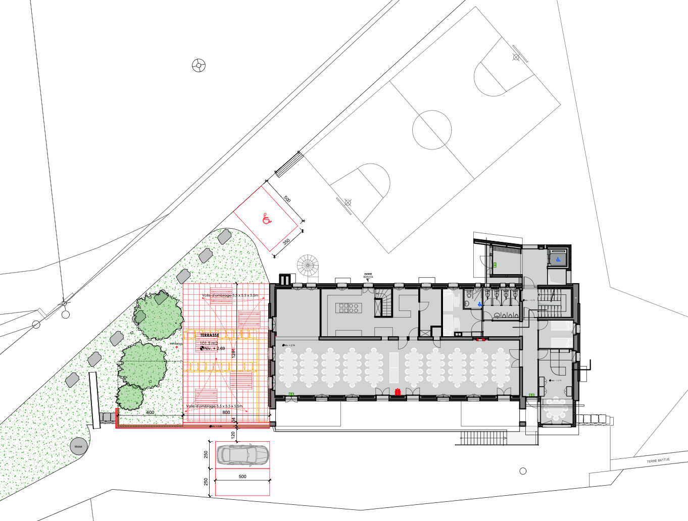 - Une zone de pique-nique dans la cour (2 tables et 5 bancs), une nouvelle zone (1 table et 2 bancs) à proximité du mur de grimpe, une terrasse ombragée avec la possibilité d’avoir des tables pour y manger.