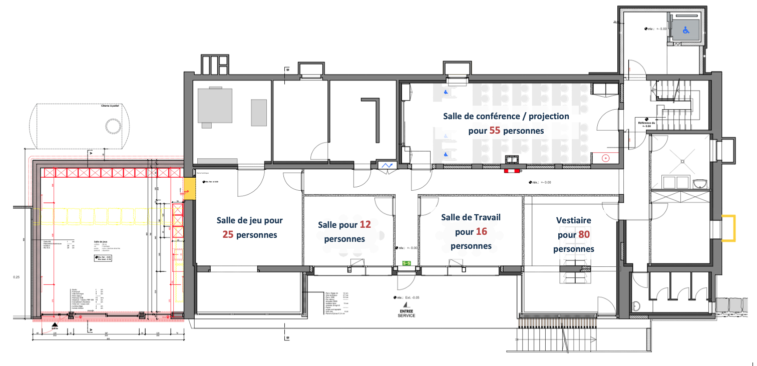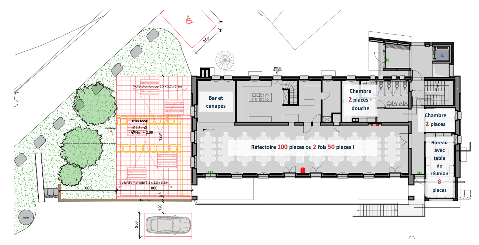 - Le Rez supérieur comporte un grand réfectoire d’une capacité de 100 places assises. Il est possible de le diviser en deux pièces égales. De plus, il est équipé d’un dispositif de projection (projecteur, écran, sonorisation, lecteur dvd/blue-ray/streaming, TV HD).
