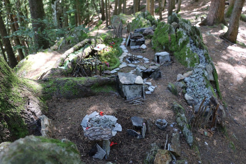 l’activité de l’après-midi, par groupe de jeu de piste (âges mélangés), consistait à construire des villages miniatures dans la forêt en utilisant uniquement des matériaux naturels. Les petits architectes et ingénieurs se sont mis en quête de cailloux, feuilles, branches…etc., afin de faire prendre forme à leurs mini-civilisations personnelles. Cela nous rappelle les débuts de Colonia, quand nous étions encore à l’âge de pierre.
